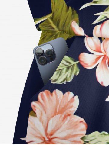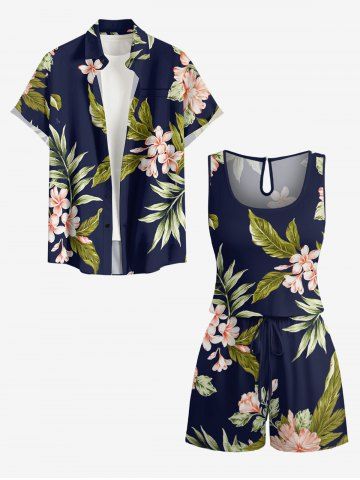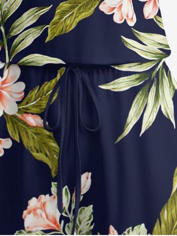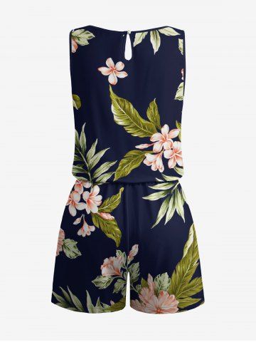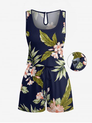 Plus Size Tropical Leaf Flower Print Hawaii Drawstring Pocket Romper - Bleu Profond - L