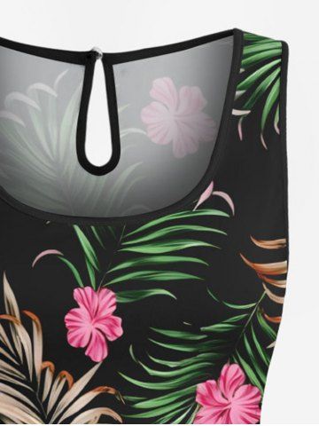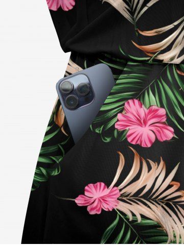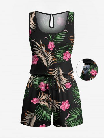 Plus Size Tropical Leaves Floral Print Hawaii Drawstring Pocket Romper - Noir - Noir