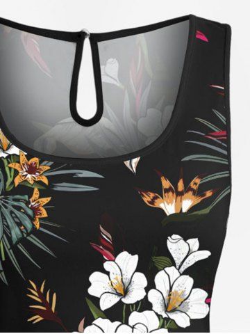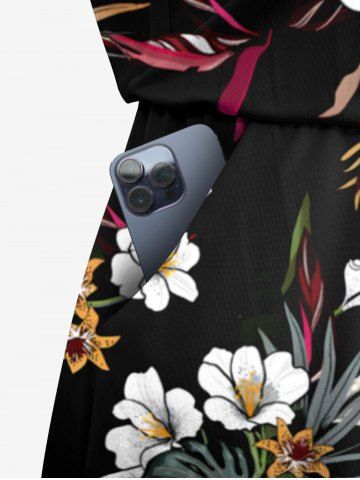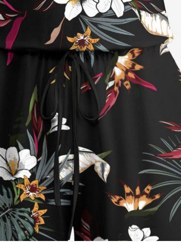 Plus Size Tropical Leaf Flower Print Hawaii Drawstring Pocket Romper - Noir - Noir