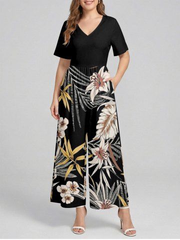 Tropical Leaf Flower Print Hawaii Wide Leg Jumpsuit - Noir - Noir