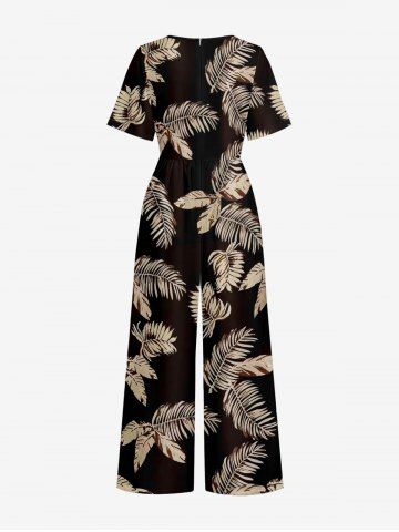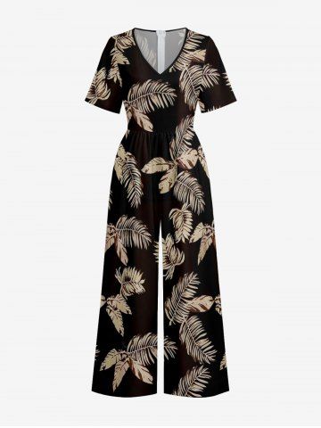 Tropical Leaf Print V Neck Hawaii Wide Leg Jumpsuit - Bronze - L