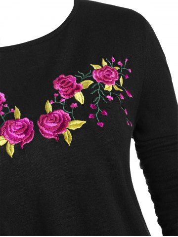 L*****r5Plus Size Flower Embroidered Colorblock Handkerchief KnitwearColor: BLACK Size: LCute top. It looks like the picture and fits true to size. This will look nice with black leggings in fall or winter months. Good quality material and good item!