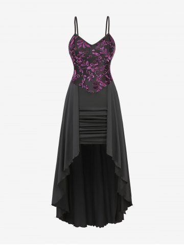 Robe Alternative Et Gothique > Robe Ligne A Gothique Haute Basse Panneau Fleuri à Bretelle Bouclée et Haut Court
