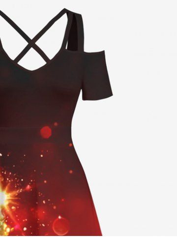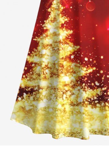 Maxi Robe Etoile Brillante 3D Sapin de Noël Imprimé à Epaule Dénudée de Grande Taille à Paillettes - Rouge - Rouge
