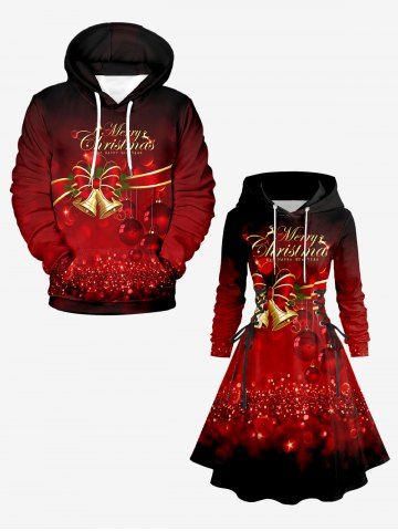 Plus Size Christmas Ball Bowknot Bell Sparkling Sequin 3D Print Lace Up Drawstring Hoodie Dress - Rouge Vineux - 3x