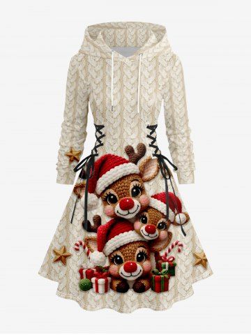 Robes > Robe à capuche grande taille avec bonnet de Noël, imprimé 3D et lacets, en maille torsadée avec motif cerf.