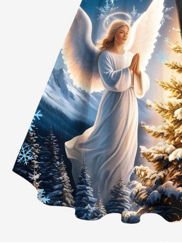 Robes > Robe trapèze grande taille à imprimé sapin de Noël, flocons de neige et anges, boutonnée et avec ceinture amovible