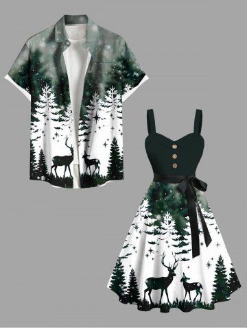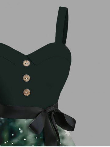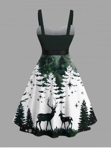 Robes > Robe trapèze grande taille à imprimé sapin de Noël, forêt, élan, flocon de neige, boutons ombrés, avec ceinture amovible
