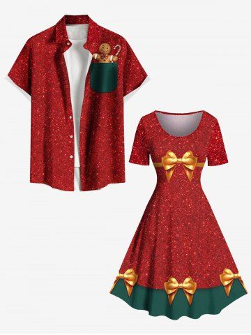 Robe vintage grande taille à nœud papillon, imprimé 3D pailleté et colorblock à sequins scintillants, style Noël. - Rouge - Rouge
