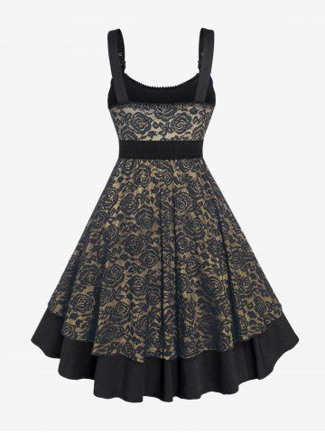 Plus Size Vintage Floral Lace Jacquard Buckled Straps Fit and Flare Belted Dress - D'or - Or