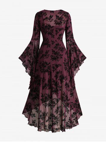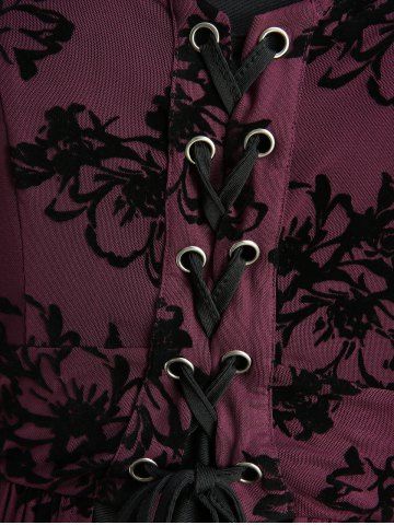 Robe grande taille à fleurs, laçage, volants, manches évasées, asymétrique et décolleté en V avec empiècement croisé. - Rouge Foncé - 3x | Us 22-24
