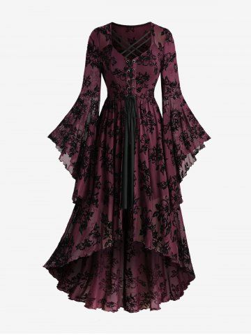 Robe grande taille à fleurs, laçage, volants, manches évasées, asymétrique et décolleté en V avec empiècement croisé. - Rouge Foncé - 5x | Us 30-32
