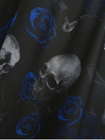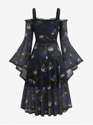 Robe grande taille à imprimé gothique crâne et rose, manches cloche en résille et épaules dénudées - Paon Bleu - 3x | Us 22-24