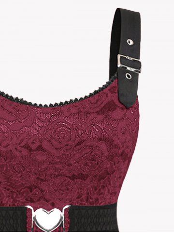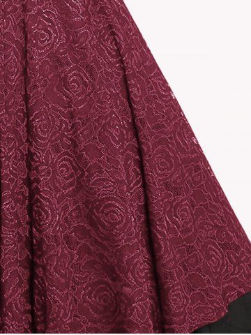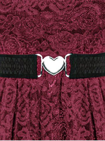 Robe Vintage Ajustée Evasée Ceinturée Bouclée Fleurie en Dentelle à Bretelle Grande Taille - Rouge Foncé - 2x | Us 18-20