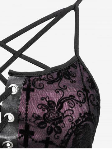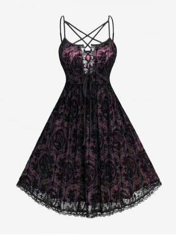 Gothic Plus Size Grommets Lace Up Ruched Cross Floral Flocking Layered Ruffles Cold Shoulder A Line Tank Dress