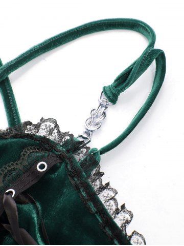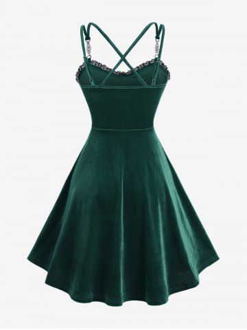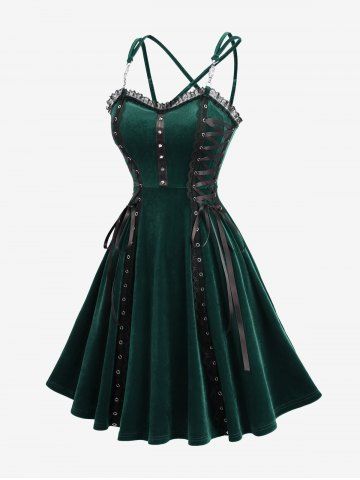 Robe trapèze en velours à bretelles croisées, lacées et rivetées, avec bretelles en PU et rivets - Vert Profond - L