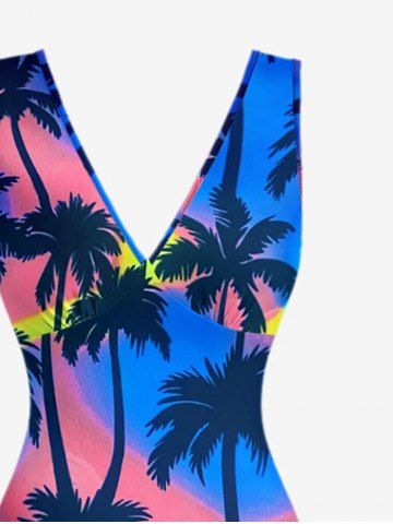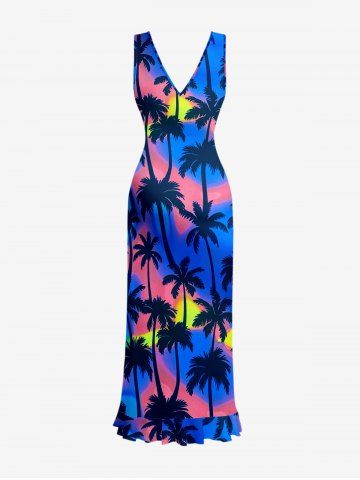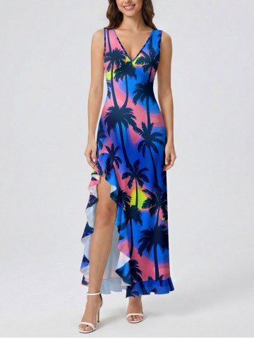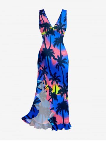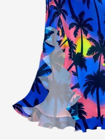 Coconut Tree Ombre Print Hawaii Ruffles Split Dress - Bleu - Bleu