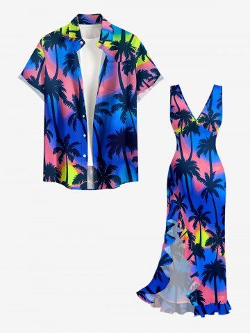 Coconut Tree Ombre Print Hawaii Ruffles Split Dress - Bleu - Bleu