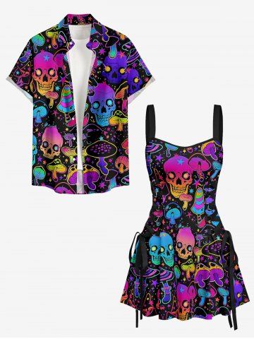 Robes Graphiques > Colorful Ombre Skulls Mushroom Print Hawaii Lace Up A Line Dress