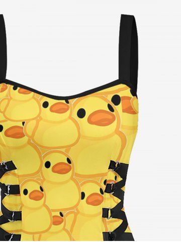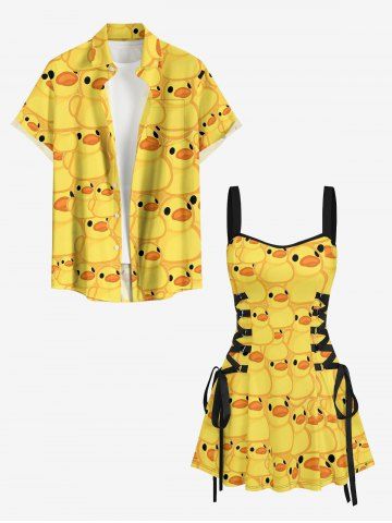 Cute Duck Print Hawaii Lace Up A Line Dress - Jaune - Jaune