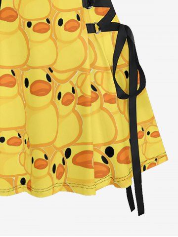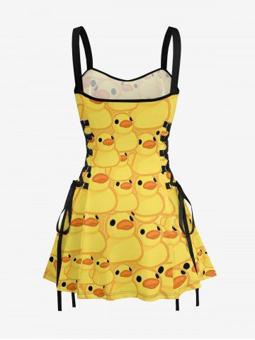 Cute Duck Print Hawaii Lace Up A Line Dress - Jaune - Jaune