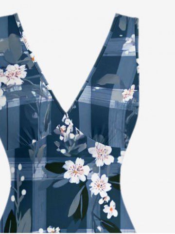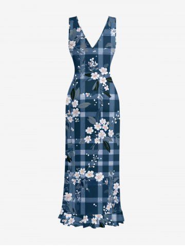 Robes Graphiques> Flower Leaf Plaid Print Hawaii Ruffles Split Dress