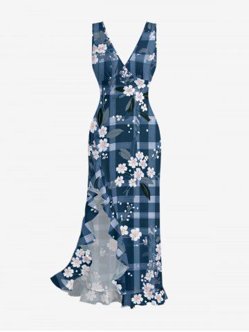 Robes Graphiques> Flower Leaf Plaid Print Hawaii Ruffles Split Dress