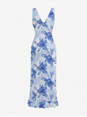 Flowers Leaf Print Hawaii Ruffles Split Surplice Dress - Bleu Ciel - Bleu Ciel