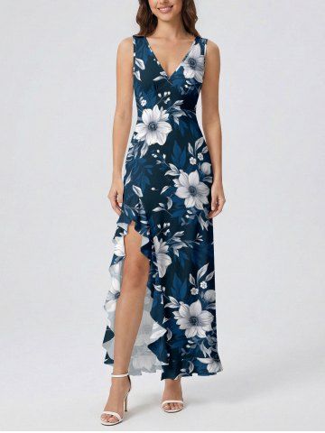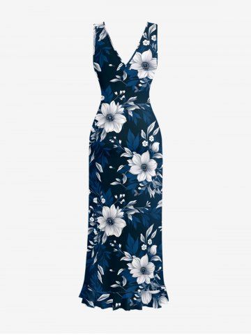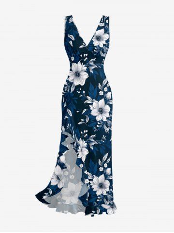 Robes Graphiques > Flowers Leaf Print Hawaii Ruffles Split Surplice Dress