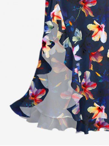 Flowers Print Hawaii Ruffles Split Surplice Dress - Bleu Profond - M