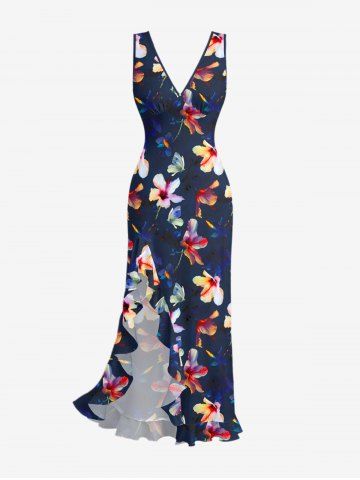 Flowers Print Hawaii Ruffles Split Surplice Dress - Bleu Profond - L