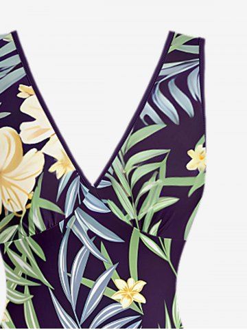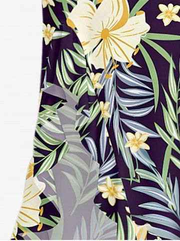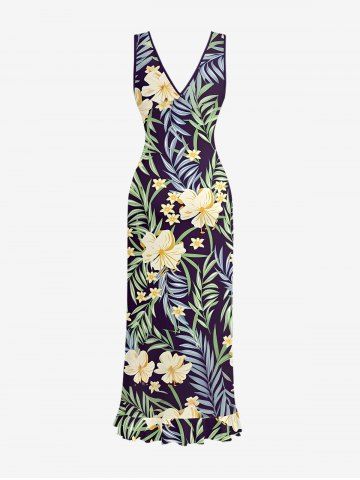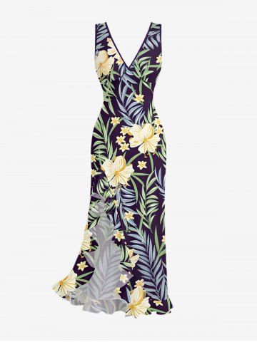 Flowers Tropical Leaf Print Hawaii Ruffles Split Surplice Dress - Bleu Profond - Xxxl