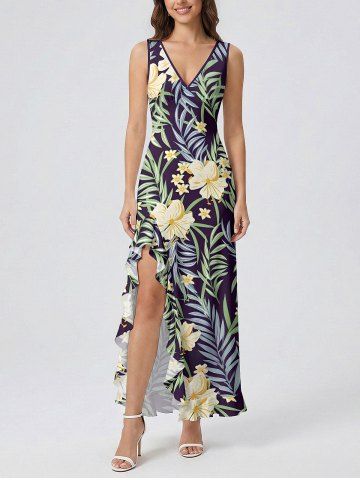 Robes Graphiques > Flowers Tropical Leaf Print Hawaii Ruffles Split Surplice Dress