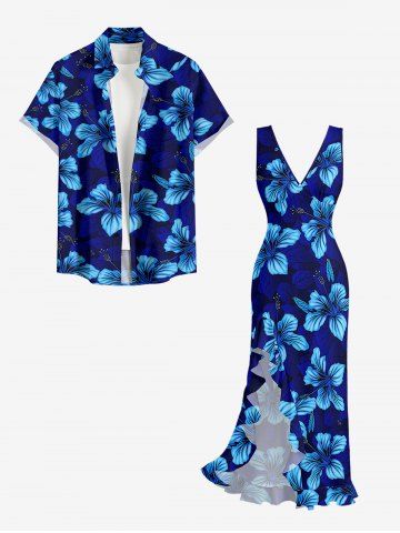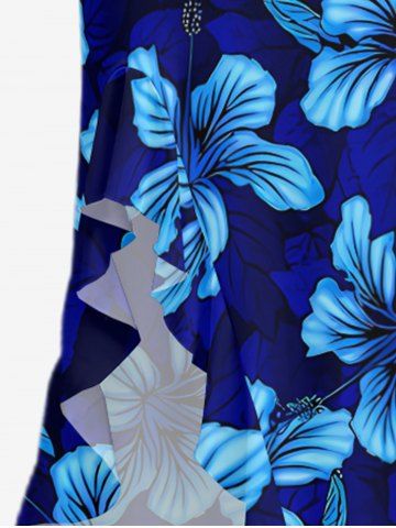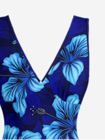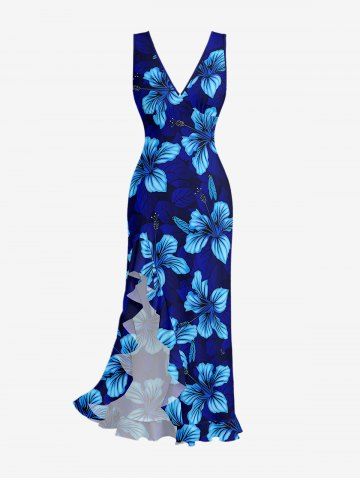 Hibiscus Flower Leaf Print Hawaii Ruffles Split Surplice Dress - Bleu - Bleu