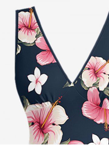Hibiscus Flowers Leaf Print Hawaii Ruffles Split Surplice Dress - Bleu Profond - M