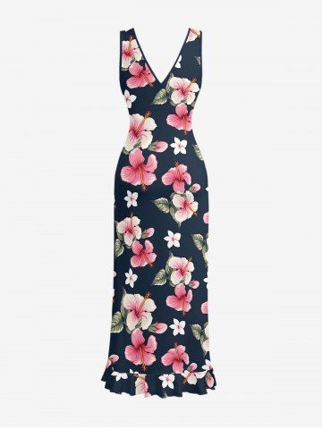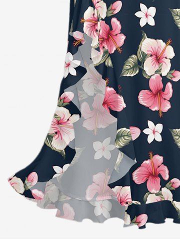 Hibiscus Flowers Leaf Print Hawaii Ruffles Split Surplice Dress - Bleu Profond - L