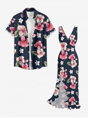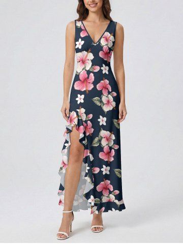 Hibiscus Flowers Leaf Print Hawaii Ruffles Split Surplice Dress - Bleu Profond - Xxl