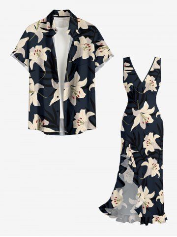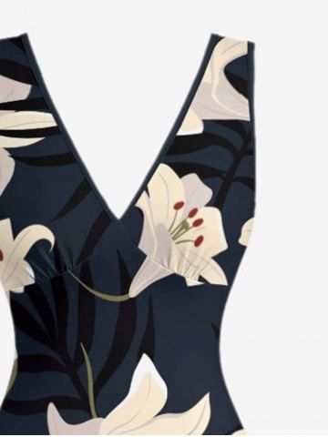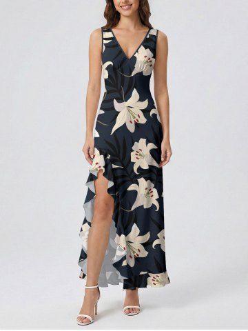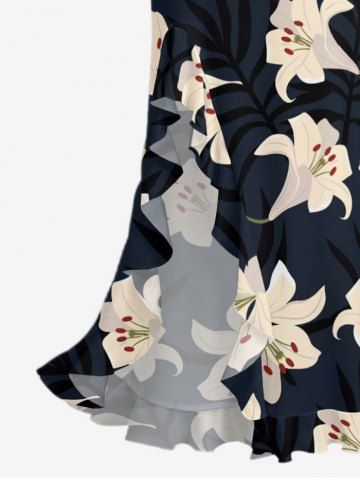 Hibiscus Flowers Tropical Leaf Print Hawaii Ruffles Split Surplice Dress - Cadetblue - L