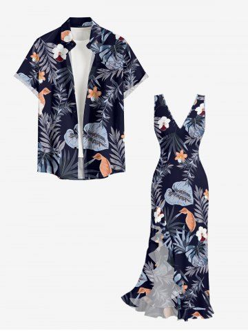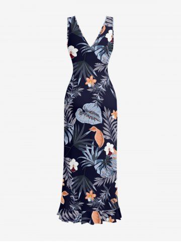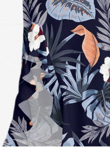 Hibiscus Flowers Tropical Leaf Print Hawaii Ruffles Split Surplice Dress - Bleu Profond - S