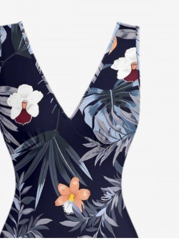 Hibiscus Flowers Tropical Leaf Print Hawaii Ruffles Split Surplice Dress - Bleu Profond - Xl