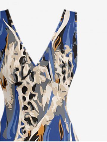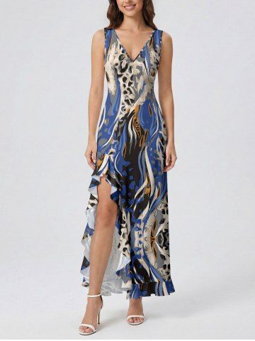 Leopard Print Hawaii Ruffles Split Dress - Bleu - Bleu