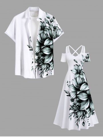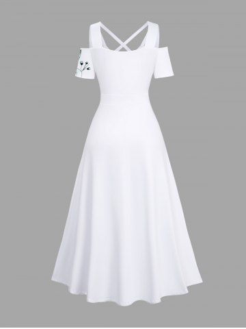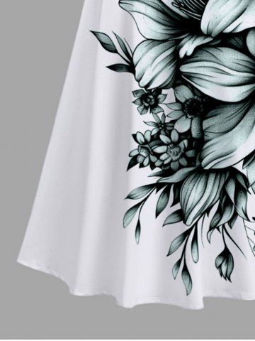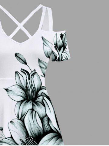 Maxi Robe Croisée Fleur Feuille Imprimées à Epaule Dénudée de Grande Taille - Blanc - Blanc