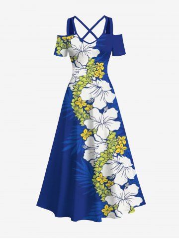 Maxi Robe D'Entraînement Croisée Fleur Feuille Tropicale Imprimée à Epaule Dénudée de Grande Taille - Bleu - Bleu