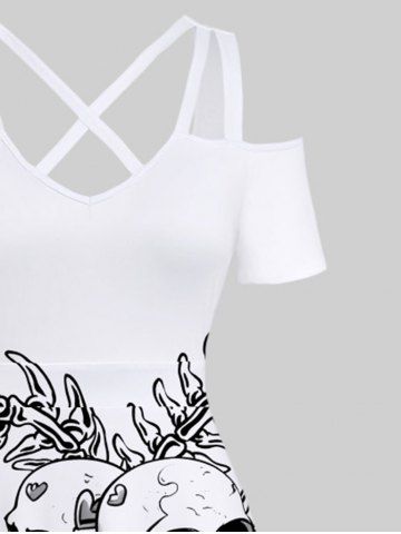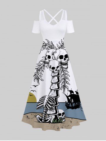Maxi Robe D'Eté Ligne A Cocotier Crâne Imprimés à Epaule Dénudée de Grande Taille - Blanc - Blanc