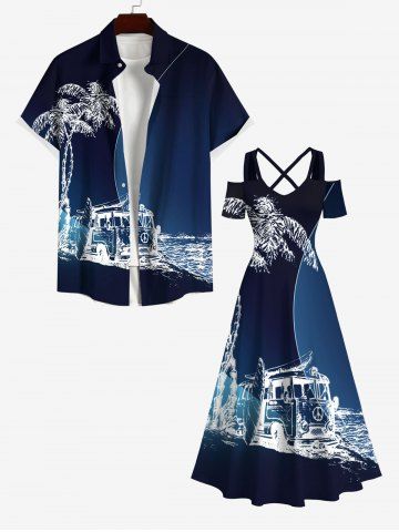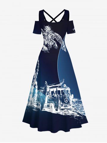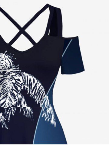 Maxi Robe Hawaïen Croisée Arbre Noix de Coco et Palmier Imprimés à Epaule Dénudée Grande Taille - Bleu De Minuit - Xs