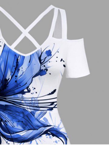 Maxi Robe Hawaïen Croisée Fleur Peinture Eclaboussée Imprimée à Epaule Dénudée de Grande Taille - Blanc - Blanc