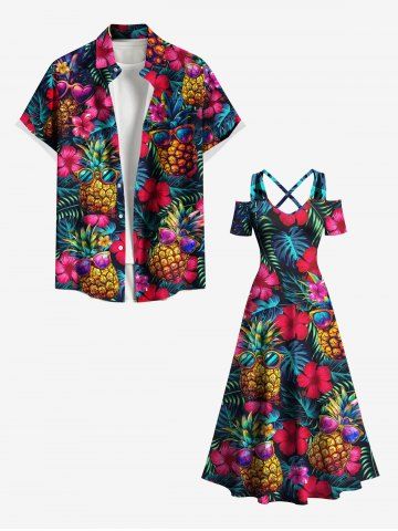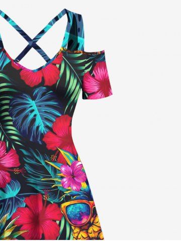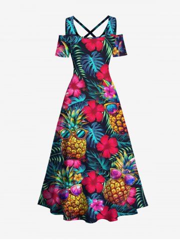 Maxi Robe Hawaïen Fleurie Feuille Tropicale et Soleil Imprimés à Epaule Dénudée de Grande Taille - Multi-a - L