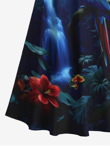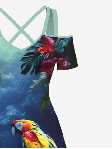 Maxi Robe Hawaïen Fleurs Perroquet Imprimé à Epaule Dénudée de Grande Taille - Bleu - Bleu