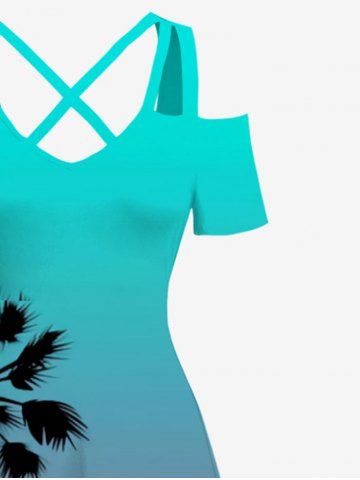 a*****h4Plus Size Cold Shoulder Coconut Tree Ombre Sky Print Hawaii Crisscross A Line Maxi DressColor: MULTI-A Size: 1XVery pretty. Nice colours and a nice material of dress. However it was a bit snug fitting in the stomach area and yet loose on the top criss-cross part.