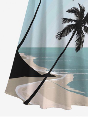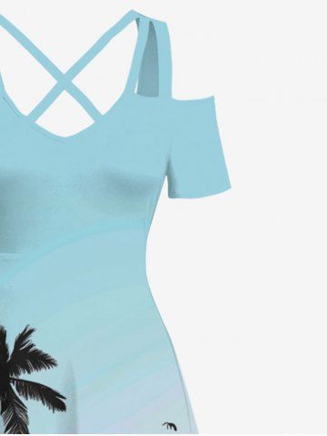 Maxi Robe Hawaïen Ligne A Ombrée Cocotier et Oiseau Imprimés à Epaule Dénudée de Grande Taille - Bleu Clair - Bleu Clair